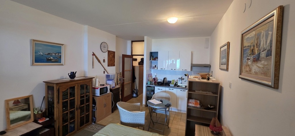 Below the balcony, there is a practical storage room. The apartment is equipped with air conditioning and is being sold fully furnished.