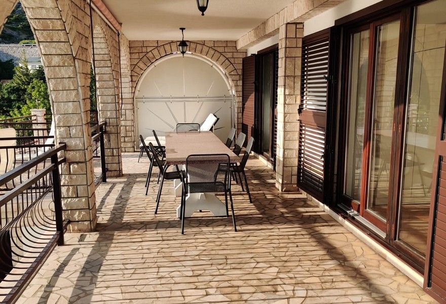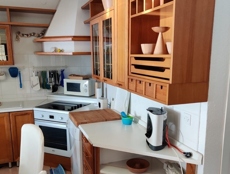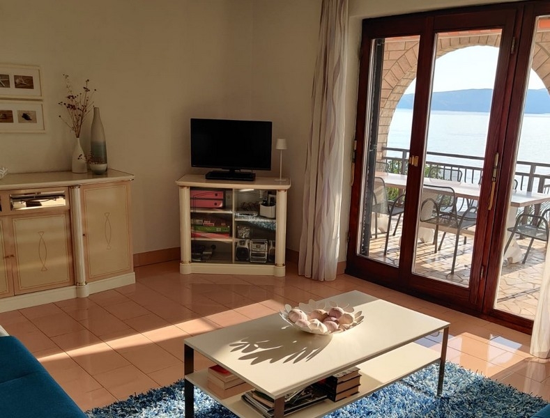 The apartment is furnished and air-conditioned. From the terrace, stairs lead directly down to the seafront, providing access for swimming.
