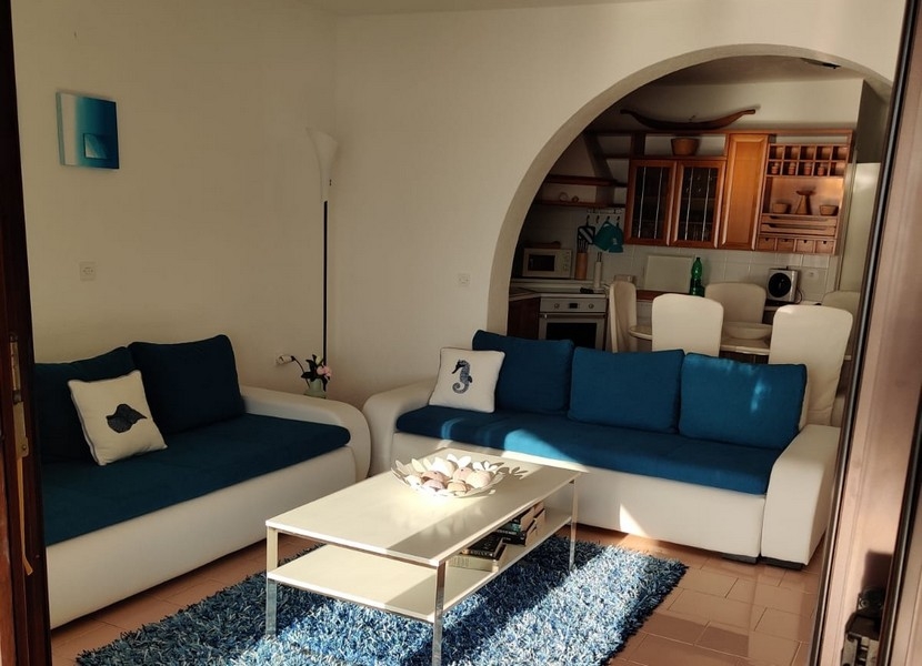 The living area of approx. 75 m² (total area = 106 m²) comprises two bedrooms, one bathroom, a living room, kitchen and dining area, as well as a spacious partially covered terrace offering a spectacular view of the sea and coastline. The apartment also includes a courtyard and a storage room.