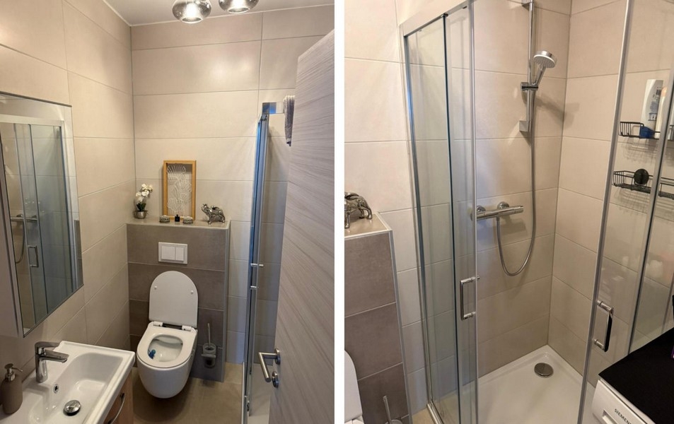 The apartment is located on the first floor of a residential building completed in 2023 and offers a total area of 60.81 m² (including an outdoor parking space; living area: 48.04 m²). It consists of two bedrooms, one bathroom, a living room with kitchen and dining area, and a spacious terrace of 22.14 m².