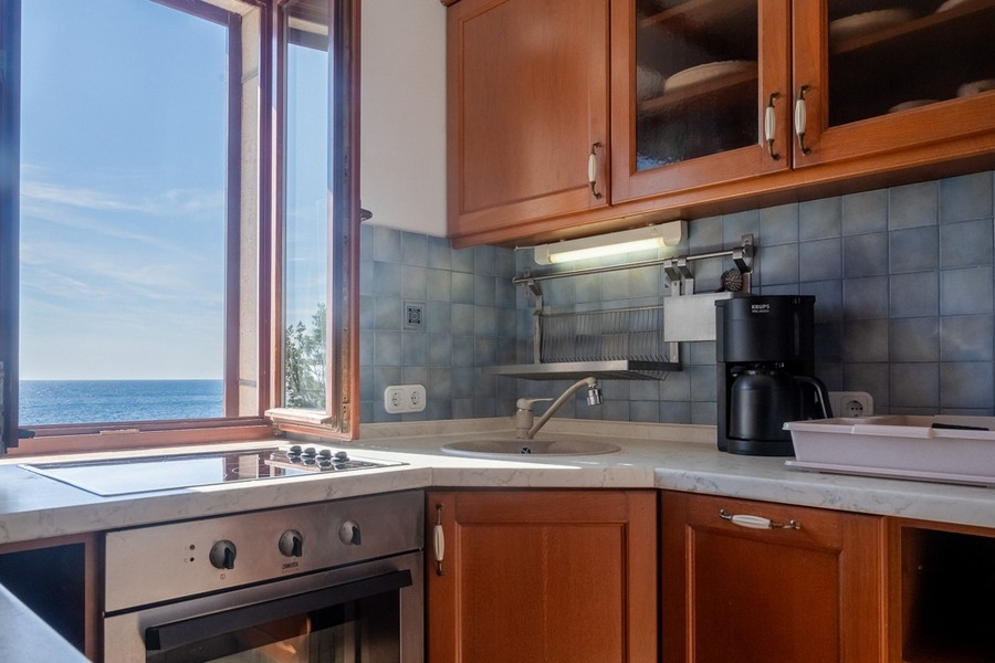 From the living area and the kitchen, there is a lovely view of the sea. The apartment is offered for sale fully furnished.