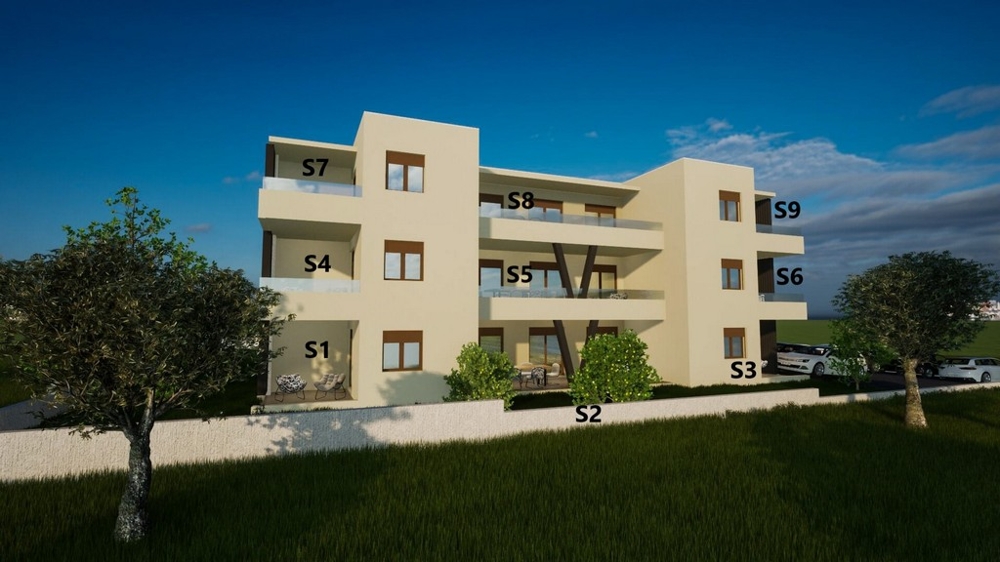 Apartment S7 with a total area of 87.71 m² (living area: 76.28 m² terrace 10.49 m² storage room 4.92 m² parking space 12.50 m²) and three bedrooms, bathroom, toilet, living room with kitchen and dining area. There is a beautiful sea view from the terrace. Purchase price: 298,000 EUR