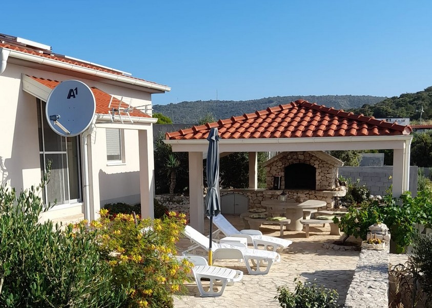 On a plot of approx. 1,350 m², enclosed by a stone wall, stands a house of about 50 m² offering two bedrooms, one bathroom, a kitchen, living and dining area, and a terrace with barbecue and seating area.