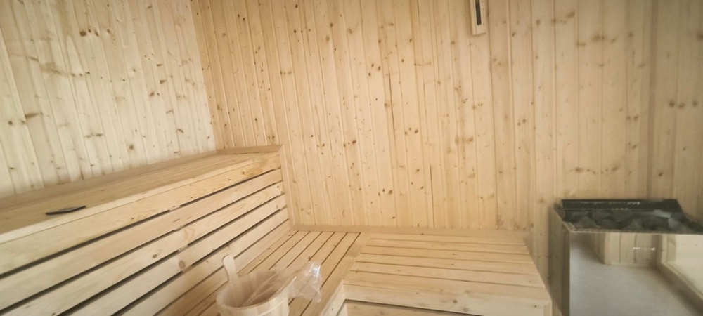 Ground floor: living room with kitchen and dining area, bathroom, sauna, fitness room, utility room, entrance area, terrace