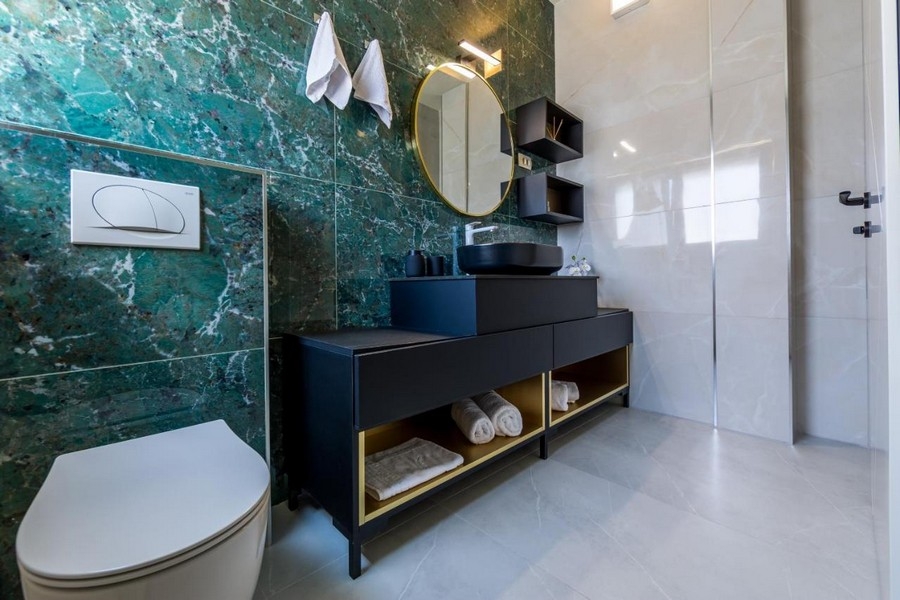 The villa features four bedrooms, each with an en-suite bathroom, an additional bathroom, a living room, kitchen and dining area, a wellness area with swimming pool, as well as spacious terraces offering a beautiful view of the Opatija Riviera and the nearby islands.