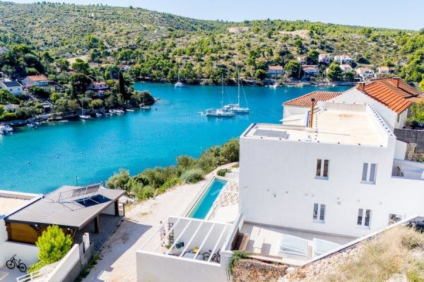 This offer is a newly built villa with a swimming pool in a panoramic location on the island of Brač in Dalmatia. The property is located in a quiet and natural environment, surrounded by Mediterranean vegetation, and offers beautiful views of the sea and the bay.