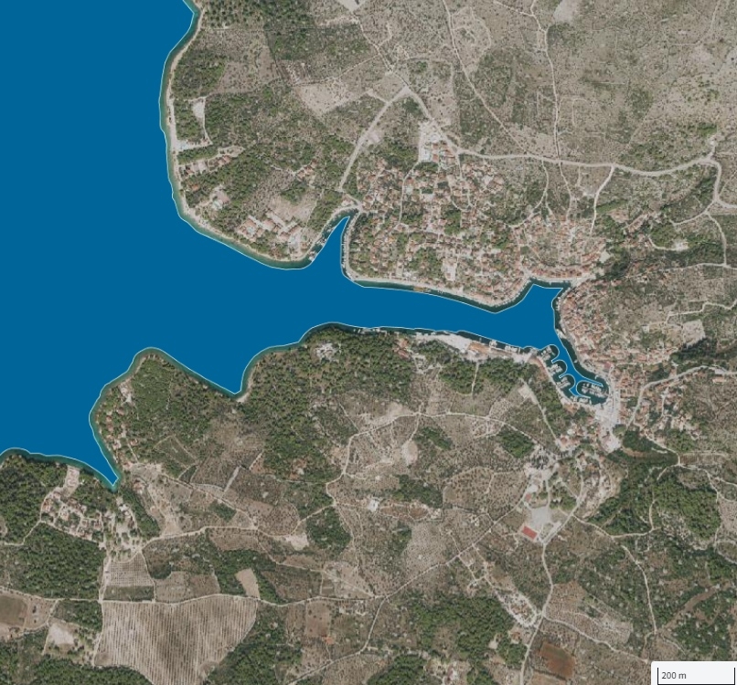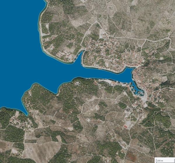 It is located between 20-40m on the marina bay of Milna in the 2nd row and has an area of approx. 100*60 m.